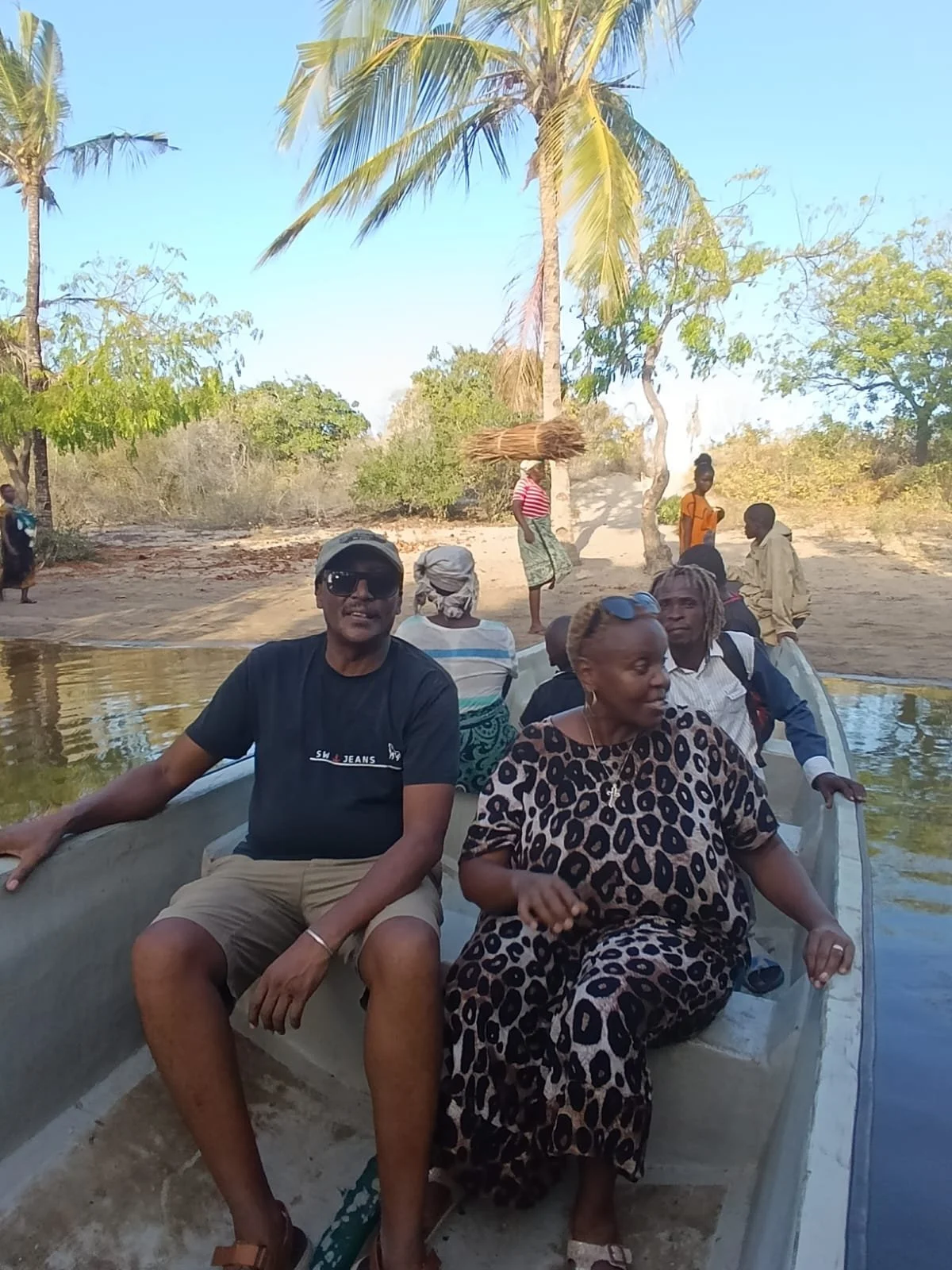 People on a boat near a riverbank with palm trees and sandy ground, some standing and some sitting, in a tropical setting.